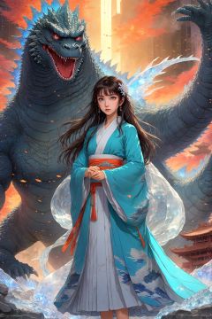 Anime style, (masterpiece: 1.3), best quality, anime works, 1girl, solo, long hair, bangs, hanfu, brunette, wide-sleeved flowing fairy skirt, (Godzilla), photo, 8k, complex, highly detailed, majestic, digital photography, broken glass, (fine and delicate beautiful eyes: 1.2), hdr, realistic, high definition, anime style, key visual, vibrant, studio animation, highly detailed,