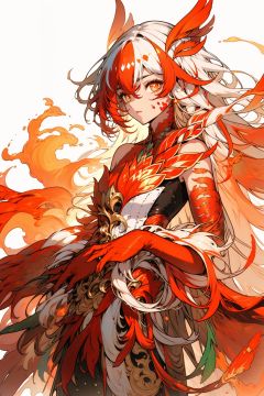 (masterpiece:1.3), (the best quality:1.2), (super fine illustrations:1.2), (Masterpiece), high quality, high detail,(white background:1.2), looking at viewer, (SOLO:1.4),outline,,simple background, armor,red legwear,thighhighs,boots,facial mark,head wings,red gloves,two-tone hair,earrings,gloves,tassel,leotard,skirt,dress,elbow gloves,twintails,bare shoulders,tattoo,phoenix,ribbon,red ribbon,bangs,white hair,orange eyes,streaked hair,fu hua,orange hair,fiery hair,hair between eyes,multicolored hair,fiery wings,jewelry,hair ornament,gloves,hair ribbon,pattern on hair,logo,yellow pupils,diamond shaped pupils, Phoenix_girl
