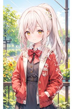 (best quality), ((masterpiece)), (highres),standing,original, extremely detailed wallpaper, (an extremely delicate and beautiful),(loli:1.2),(petite:1.2),Pink hair,Yellow eyes, (red Jacket),high ponytail,white collared shirt,hair flower,fipped hair,floating hair,Frown,hands in pockets,black dress,red bowtie,(solo),sky, skyline, skyscraper, smile, solo, sunflower, tower, upper_body,white flower