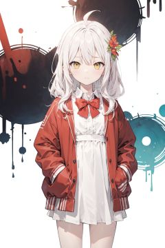 (best quality), ((masterpiece)), (highres),standing,original, extremely detailed wallpaper,crown,(an extremely delicate and beautiful),(loli),(petite),white hair,bangs,ahoge,hair flowing over,curly hair,long hair,Yellow eyes, (red Jacket),white collared shirt,hair flower,fipped hair,floating hair,Frown,hands in pockets,black dress,red bowtie,(solo),cozy anime
