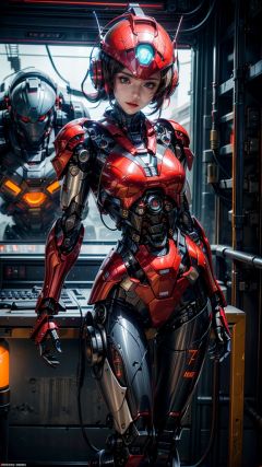 1girl, armor, blue eyes, breasts, cyberpunk, glowing, helmet,Streamlined mecha,Close fitting mecha,Part of the complex mecha structure,Smooth metal surface, joints, lips, looking at viewer, medium breasts, red hair, robot joints, science fiction, solo, standing