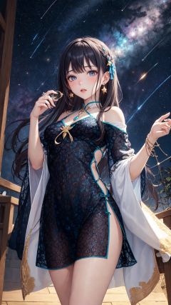 (8K, masterpiece, top quality, best quality,official art, beautiful and aesthetic:1.2), 1girl, INOUE Naohisa style, aurora, bangs, bare_shoulders, breasts, constellation, crescent_moon, earrings, earth_\(planet\), fireworks, galaxy, jewelry, light_particles, long_hair, milky_way, multicolored_hair, necklace, night, night_sky, off_shoulder, parted_lips, planet, shooting_star, sky, solo, space, star_\(sky\), star_\(symbol\), starry_background, starry_sky, starry_sky_print, very_long_hair,,tutututu, see-through, cheongsam, <lora:tutuqpqp_0001:0.75>