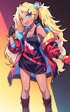 <lora:add_detail:0.5>,<lora:Kirara-mul-000008:0.8>,cowboy shot,Kirara_hoodie,1girl,solo,blonde hair,dark skin,dark-skinned female,twintails,open mouth,blue eyes,smile,jewelry,jacket,hair ornament,hairclip,gloves,holding,looking at viewer,off shoulder,fingerless gloves,long hair,boots,belt,red jacket,earrings,:d,standing,**** top,teeth,black footwear,bracelet,