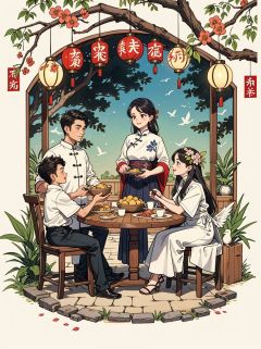 In the 1980 s and 1990 s in China,there were many people in the family room. They were very lively,celebrating the New Year,celebrating the festival,all kinds of retro furniture,retro electrical appliances,nostalgic retro,big round tables of ten people,Chinese New Year's Eve dinner,celebrating the New Year's Eve dinner,many people gathered around the high round tables,uncles,aunts,grandpa,grandma,adults,children,children,warm and happy atmosphere,, A ink painting of a tranquil orchard with Chinese writing on it and a pair of birds building their nest, with a fruit-laden branch in the foreground, An Zhengwen, organic painting, a minimalist painting, art & language, ink and wash,