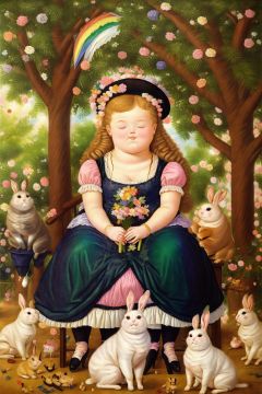 Create a lively and cheerful scene with a baby in a rainbow-colored outfit sitting in a garden, accompanied by a playful bunny. Flowers, butterflies, and rainbows decorate the surroundings, presenting a delightfully whimsical tea party,Renaissance,Renaissance period,Fernando Botero