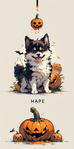 monochromatic thick line doodle, Flat minimal 2D illustration, of a happy dog turned sideways, asking for food, looking up, abstract, minimalistic, vector art, white background, white space, white and black color scheme.tuya,monochrome, MBE_style simple drawing, minimalism, cute,pumpkin,halloween <lora:Uiahalloween:0.8>