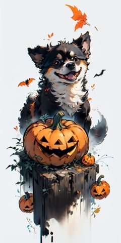 monochromatic thick line doodle, Flat minimal 2D illustration, of a happy dog turned sideways, asking for food, looking up, abstract, minimalistic, vector art, white background, white space, white and black color scheme.tuya,monochrome, MBE_style simple drawing, minimalism, cute,pumpkin,halloween <lora:Uiahalloween:0.8>