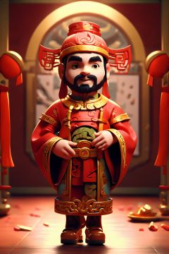masterpiece,best quality,caishen,1man,(facial hair:1.2),solo,chibi,chinese clothes,male focus,looking at viewer,long sleeves,wearing red caishen_headwear,wide sleeves,robe,smile,full body,golden,<lora:caishen_v2.0:0.8>,<lora:C D_20230617011627:1>,