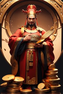 masterpiece,best quality,caishen,1man,facial hair,solo,chinese clothes,male focus,looking at viewer,long sleeves,wearing red caishen_headwear,wide sleeves,robe,smile,full body,coin,golden yuanbao,<lora:caishen_v2.0:0.8>,