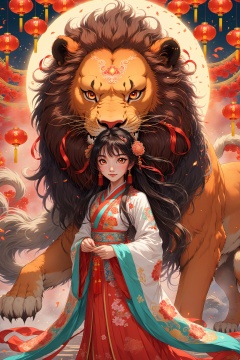 Bust photo, (masterpiece: 1.3), best quality, anime, Shinkai Makoto painting style, two-dimensional, 1girl, solo, long hair, bangs, Hanfu, firecrackers, lanterns, Chinese Spring Festival, black hair, wide sleeves elegant fairy dress, (lion dance), 8k, complex, highly detailed, majestic, festive, (fine and delicate beautiful eyes: 1.2), high definition, key vision, vibrant, 2d, highly detailed, 32k
