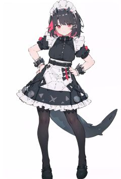 8k, best quality, masterpiece, (ultra-detailed:1.1), (high detailed skin), (full body:1.2), white background, standing, looking at viewer, (solo:1.4), hand on hip, <lora:sharkmaid-v100-000029:0.8:lbw=OUTALL>, maid, Ellen Joe, tail, shark girl, (shark:-0.5), 1girl, red eyes, tail, pantyhose, multicolored hair, black footwear, short sleeves, apron, wrist cuffs, maid headdress, (white background, simple background:1.4), <lora:EnvyBetterHands LoCon_beta2 辅助:0.55>, ( good hands, nice hands:0.5), (beautiful_face), ((intricate_detail)), clear face, ((finely_detailed)), fine_fabric_emphasis, ((glossy)), full_shot