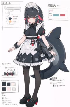 multiple views, pencil sketch, (sketch:1.25), (little girl,small breasts,), ((no shoes)), shy, best quality, graphite \\(medium\\), ske, gradient, rainbow, note, Line draft, highres, absurdres, (ultra-detailed:1.1), (illustration:1.1), (infographic:1.2), pajamas, (all clothes configuration:1.15), (solo), perfectly drawn hands, standing, cohesive background, paper, action, (character design:1.1), <lora:sharkmaid-v100-000029:0.8>, maid, Ellen Joe, 1tail, shark girl, (shark:-0.5), 1girl, red eyes, tail, pantyhose, multicolored hair, black footwear, short sleeves, apron, wrist cuffs, maid headdress