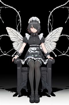 (:cyan:0.6):1.12222, {(:blue:0.9):1.11111}, {(black::0.5):1.13333}, (black and white color scheme:1.85), (Front Focus:1.4), (beautiful detailed eyes:1.1), (beautiful detailed girl:1.2), (solo:1.2), (Black Butterfly Wings Silhouette :1.6), (Black Butterfly Wings Shape Shadow:1.6), <(wings with Black Butterfly:1.6)>, <(Black Butterfly wings with Throne)>, full body, standing, <lora:sharkmaid-v100-000029:0.8>, maid, Ellen Joe, 1tail, shark girl, (shark:-0.5), 1girl, red eyes, tail, pantyhose, multicolored hair, black footwear, short sleeves, apron, wrist cuffs, maid headdress, BREAK(contrasting colors:1.4), (only Character Coloring:1.4), (eyes_partially_colored:1.6), (partially colored:1.4), (grotto:1.4), (vines:1.4), (Ring of Thorns:1.3)