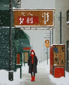 dancai, solo, snow, outdoors, sign, building, snowing, wide shot, 1girl, coat, red footwear, black pants, black coat, boots, standing, <lora:淡彩_人物_V1.0XL:1>, masterpiece, best quality,