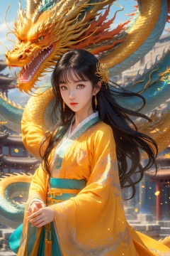 Anime style, (masterpiece: 1.3), best quality, animation works, 1girl, solo, long hair, bangs, hanfu, black hair, wide sleeve flowing fairy skirt, (golden dragon), photos, 8k, complex, highly detailed, majestic, digital photography, broken glass, (fine and delicate beautiful eyes: 1.2), hdr, lifelike, high-definition, animation style, key vision, vibrant, studio animation, highlydetailed,,