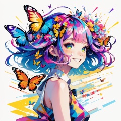 dancing, colorful hair,hair ornament, smile,((Harajuku Fashion)), (Flower in eyes:0.6), double exposure, fussion of Fluid abstract art,glitch, (Original illustration composition), (fusion of limited color,Maximalism artstyle,Geometric artstyle,Butterflies,Junk art:0.75)