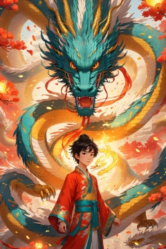 Traditional Chinese Festival, Spring Festival, Firecrackers, Lanterns, Red Background, (Masterpiece: 1.3), Top Quality, Animation Works, 1 Boy, Solo, Hanfu, Dragon Robe, Black Hair, Wide Sleeve, Majestic, Pride Eagle, (Golden Chinese Dragon), Photo, 8k, Complex, Highly Detailed, Majestic, Digital Photography, Broken Glass, (Fine and Delicate Eye: 1.2), HDR, High Definition, Animation Style, Key Vision, Vibrant, Studio Animation, Highly Detailed,