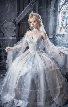 Petal skirt,flowers,(Real photos:1.2),(A beautiful young blonde girl stands gracefully inside a church:1.2),positioned according to the golden ratio spiral. She gazes ahead with bright blue dreamy eyes,upper_body,earrings,jewelry,ice and snow crown,solo,exquisite eyes,gradient_background,bangs,dress,shiny skin,conforming to common sense,perfect figure,(ice wedding dress:1.2),snow world,sitting on the throne,long leg,<lora:ice cake_20231126200433-000019:0.7>,(snow world:1.2),ray tracing,(best quality),((masterpiece)),extremely detailed 8K wallpaper,(an extremely delicate and beautiful),incredibly_absurdres,intricate detail,exquisite eyes,<lora:lolita_洛丽塔裙子_款式1:0.4:lbw=1,1,0,0,0,1,1,1,1,1,1,1,1,1,1,1,1>,