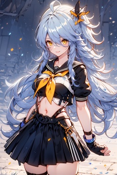 1girl, skirt, solo, yellow eyes, black skirt, looking at viewer, grey hair, bangs, short sleeves, gloves, closed mouth, smile, pleated skirt,  ahoge, hair over one eye, school uniform, neckerchief, long hair, hair between eyes, fingerless gloves, hair ornament, shirt, black gloves, serafuku, breasts, sailor collar, yellow neckerchief,sifengyuanyuXF,