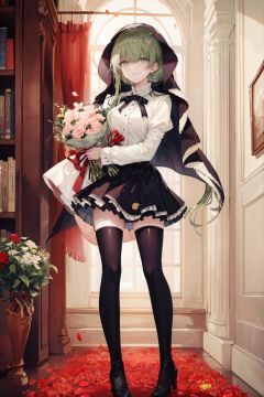 1girl,solo,red flower,flower,rose,long hair,skirt,thighhighs,bouquet,red rose,petals,green hair,thigh boots,black footwear,very long hair,bangs,holding,boots,high heels,shirt,smile,high heel boots,long sleeves,wide sleeves,standing,white shirt,:d,black skirt,looking at viewer,holding bouquet,full body,veil,pleated skirt,hair between eyes,red skirt,open mouth,puffy sleeves,green eyes,black thighhighs,frilled skirt,blush,<lora:hewuwazanohdLycoris:0.7>,