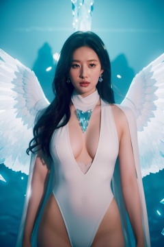 cinematic photo official art,unity 8k wallpaper,{{masterpiece}},floating,Hydaelyn(ffxiv),gorgeous details,huge silvery angel wings,sharp wings,blue crystal chip aura,mother,white bodysuit,prominent blue lace pattern,pure white skin,white cape,white crystal sword,blue eyes, solo,sharp crystal feet, medium boob,medium long curly hair,head wings,huge blue glow crystal In the background,divinity,elegant,kindly,sacred,orderly,In the starry sea floor,best quality,photorealistic,elegant,romanticism, film, professional, highly detailed, skin detail realistic,looking at viewer, monkren