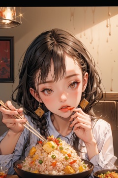 absurdres,incredibly absurdres,reality,realistic,,(full_shot:1.6),1girl,, Eat Fried Rice, Spoons, chopsticks