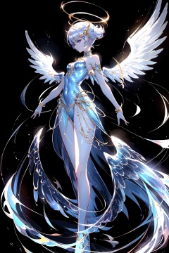 a close up of a person with a halo on a black background, glowing angelic being, ethereal angelic being of light, wings made of light, ethereal wings, angelic light, tron angel, angel spirit guide, angelical, ethereal anime, of beautiful angel, astral fairy, big white glowing wings, infinite angelic wings, goddess of light, beautiful angel, epic angel wings