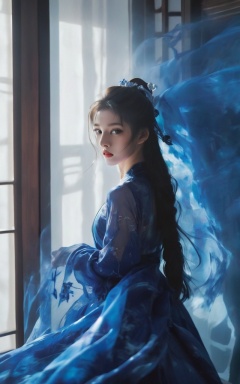 (abstract art:1.4), masterpiece, best quality, ultra high res, beautiful, visually stunning, (1girl:1.3), (dark blue theme:1.2), deep blue, cowboy shot,girl,wuxia,Chinese style,(Small chest:0.75),niji, sunlight, monkren