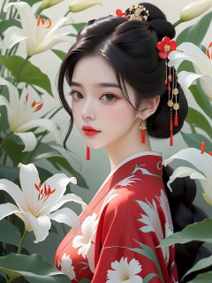 pallor,1girl,black hair,chinese clothes,floral background,floral print,flower hair,ornament,lily \(flower\),portrait,red lips,simple background,solo,white flower,