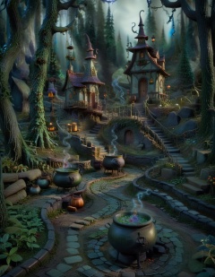 stopmotion, a Witch, spellcaster, cauldron, magic, mysterious, spellbinding, enigmatic, sorcery, mystical, wise. in Witch's Enchanted Forest: Winding paths, bubbling cauldrons, enchanted wildlife, talking trees, magical herbs., tilt-shift, gloomy <lora:STOPMO_2.0_RC:1.0>