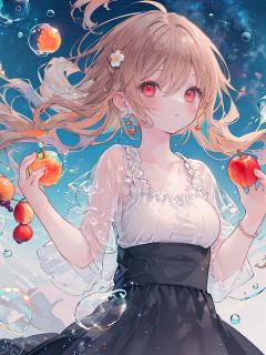 ((best quality)), ((masterpiece)), ((ultra-detailed)), (illustration), (detailed light), (an extremely delicate and beautiful), ((masterpiece), illustration, (best quality), (painting), (backlighting:1.1), (Floating bubbles:1.3), (Beautiful Sky:1.15), cumulusm\(append\), (((best quality)), ((masterpiece)), ((ultra-detailed)), (illustration), (detailed light), (an extremely delicate and beautiful), ((masterpiece), illustration, (best quality), (painting), (backlighting:1.1), (Floating bubbles:1.3), (Beautiful Sky:1.15), cumulusm\(append\), (1girl, solo, long_hair, breasts, looking_at_viewer, blush, bangs, brown_hair, hair_ornament, red_eyes, dress, hair_between_eyes, jewelry, medium_breasts, closed_mouth, braid, short_sleeves, earrings, lying, parted_lips, food, hand_up, on_back, nail_polish, black_dress, bracelet, see-through, fruit, apple, see-through_sleeves, grapes, orange_\(fruit\), red_apple:1.2), cute face, upper body, two legs, long dress, (beautiful detailed eyes), stars in the eyes, messy floating hair, colored inner hair, Starry sky adorns hair, (lots_of_big_colorful_Bubble), [pearl], [Galaxy], depth of field,<lora:EMS-70813-EMS:0.800000>