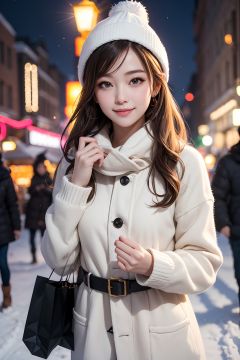 masterpiece,best quality,1girl,shiny skin,cinematic lighting,medium breasts,looking at viewer,messy hair,blonde hair,yellow eyes,solo,autumn,outdoors,smile,(a pale flush, alive skin),winter,ribbed,walking,city,shopping,dynamic angle,close-up,ultra-detailed,8k,rtx,ambient occlusion,rim lighting,bustling,a fashion influencer,winter outfit,snowy,winter,cold,Muffler,(The streets at night were all in the Christmas spirit.),(make a dent in one's impression.),