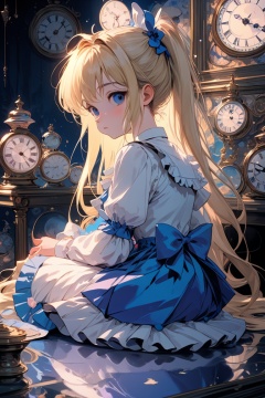 ultra-detailed,(best quality),((masterpiece)),(highres),original,extremely detailed 8K wallpaper,(an extremely delicate and beautiful),,anime,,Alice in Wonderland,1girl blonde straight hair serious stocking sit clocks ( manga-anime , gradient by Yuumei Victo Ngai),