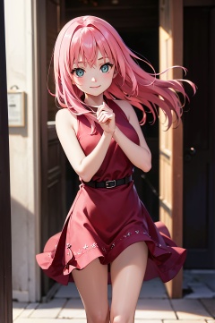 DSLR, (Good structure), HDR, UHD, 8K, A real person, Highly detailed, best quality, masterpiece, 1girl, realistic, Highly detailed, (EOS R8, 50mm, F1.2, 8K, RAW photo:1.2), ultra realistic 8k, (best illumination, best shadow, extremely delicate and beautiful), (official art, beautiful and aesthetic:1.2), solo, 1girl, , Wind, flowing hair, kind smile, , pose for picture, Dynamic pose, looking_at_viewer, , (perfect body), chunyeying,pink_hair,dress