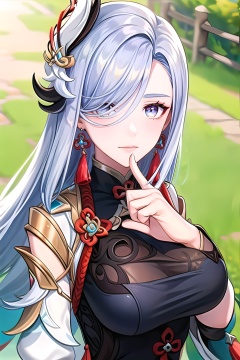 yuanshen,shenhe \(genshin impact\),1girl,solo,long hair,hair ornament,earrings,jewelry,looking at viewer,blue eyes,hair over one eye,outdoors,grass,tassel earrings,bangs,closed mouth,grey hair,polearm,breast curtain,tassel,portrait,nice hands,