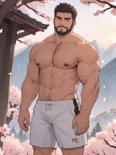 Best quality, masterpiece, ultra high res, detailed background, game_cg, muscular male, mature male, bara stocky, thick arms, thick thighs, full shot, (topless:1.2), looking at viewer, beard, birds, hands up, standing, Mountains, flower field, (Sakura:1.2), Sunset, dusk, depth of field, Hand scratch head, outdoors, A large number of cherry blossom petals floating in the sky