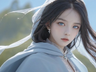 masterpiece,best quality,wlop, 1girl, solo, blue eyes, bug, butterfly, parted lips, mole under eye, veil, portrait, mole, looking away, hood, lips, looking to the side, eyelashes, blue background, long hair, teeth, jewelry, nose, hand up, sky, close-up, gem, blue sky, hood up, wind, white hair, realistic, day, grey hair, floating hair, looking afar, fingernails, bangs, sleeves past wrists, cloak, simple background, outdoors, looking at viewer,