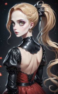 zzstyle,(masterpiece, best quality:1.2), (face focus:1.4), back focus, from behind, blonde hair, long hair, high ponytail, long ponytail, red eyes, long eyelashes, thick eyelashes, looking at viewer, red dress, backless dress, gold trim dress, puffy sleeves, juliet sleeves, long sleeves, red sleeves, (black background:1.2), light particles, blurry, bloom, shiny hair,