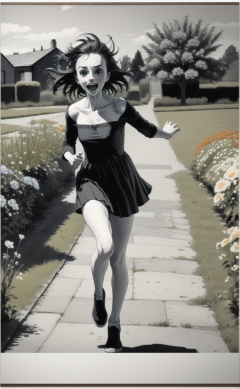 zzstyle,sketch, monochrome, traditional media, pencil drawing, 1girl, strapless dress, running in the garden, floral background,