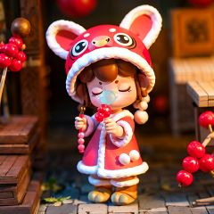Nanci, 1girl, blue nasal mucus blister, closed eyes, food, solo, photo background, blurry background, blurry, hat, holding, standing, brown hair, dress, facial mark, furry, holding food, dango, animal ears, eating, fur trim, candied haws on a stick, red clothes, Tiger headed hat,<lora:Nanci:0.8>,