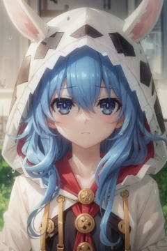1girl, solo, blue eyes, blue hair, hood, animal hood, looking at viewer, long hair, rain, animal ears, rabbit hood, rabbit ears, hair between eyes, hood up, portrait