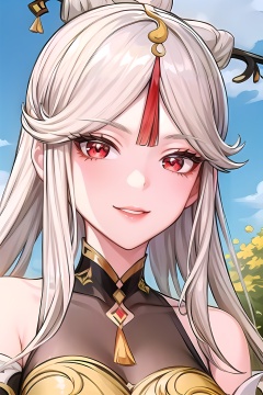 yuanshen,1girl,ningguang \(genshin impact\),solo,long hair,hair ornament,flower,red eyes,breasts,white hair,looking at viewer,tassel,bangs,claw ring,medium breasts,bare shoulders,sky,sidelocks,parted bangs,outdoors,hairpin,,Silly Smile,portrait,upper_body,