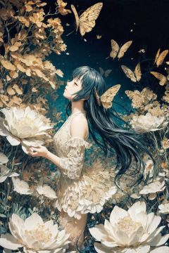 abstract art,  (style of Yuko Shimizu:1.3),  (black theme:1.1),  gold theme,  golden butterflies,  dark stars,  1girl,  field of white flowers,  ,  facing viewer,<lora:EMS-1495-EMS:1.000000>,<lora:EMS-8303-EMS:0.800000>