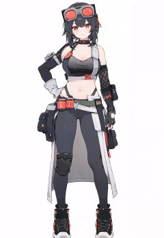 8k, best quality, masterpiece, (ultra-detailed:1.1), (high detailed skin), (full body:1.2), white background, standing, looking at viewer, (solo:1.4), hand on hip, <lora:grace-v100-000028:0.85:lbw=PUTALL>, grace, 1girl, gloves, breasts, black hair, navel, pants, red eyes, sneakers, goggles on head, (white background, simple background:1.4), <lora:GoodHands-vanilla:0.55>, ( good hands, nice hands:0.5), (beautiful_face), ((intricate_detail)), clear face, ((finely_detailed)), fine_fabric_emphasis, ((glossy)), full_shot