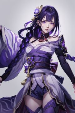 leidian, 1girl, raiden shogun, solo, weapon, long hair, purple hair, human scabbard, purple eyes, japanese clothes, sword, musou isshin \(genshin impact\), holding weapon, bangs, holding sword, holding, kimono, hair ornament, obi, sash, braid, looking at viewer, flower, drawing sword, obiage, bridal gauntlets, purple flower, closed mouth, electricity, breasts, ribbon, obijime, shoulder armor, armor, wide sleeves, tomoe \(symbol\), large breasts, tassel