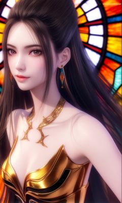(,1girl, ,best quality, )<lora:357-DA-天行九歌-焰灵-红装:0.7>,,ultra detailed background,ultra detailed background,ultra realistic 8k cg,,, (close-up portrait),(upper body:1.22),(realistic:1.11),(Photo-referencing),HDR,Studio Lighting,Soft Lighting, ,, a slender petite little girl,Delicate muscle lines,(Skinny body),(solo:1.5),( looking at viewer:1.22),The white shiny skin, (smirk:1.2),(dynamic pose),(arms behind back),arms at sides, (very long payot),(Absurdly long Brown straight hair:1.22),parted bangs, (floating hair), (jewelry:1.17), necklace, earrings,(colorful:1.27),(stained glass background),(),(()),,