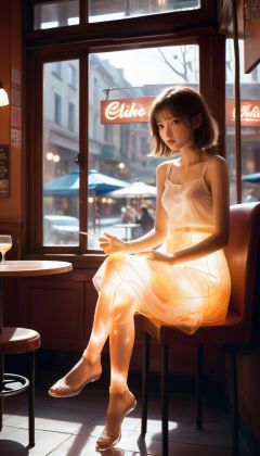 A girl sits in a café,her limbs translucent and glowing softly,drawing curious glances from those around her.,