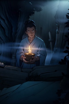(masterpiece:1.3),best quality,highres,extremely detailed CG,perfect lighting,8k wallpaper,,ghostly aura, swirling mist, ethereal figure, pale complexion, flowing robes, haunting gaze, transparent hands, flickering candlelight, eerie silence, ancient tomb, solemn atmosphere