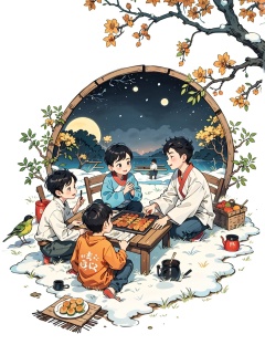(5 boys watching and playing with each other),whole body (Laurie:1.2),camping,picnicking,barbecue,barbecue,winter,snow,night,children's illustrations,masterpiece,best quality,<lora:古风插画LORA:0.9>,, A ink painting of a tranquil orchard with Chinese writing on it and a pair of birds building their nest, with a fruit-laden branch in the foreground, An Zhengwen, organic painting, a minimalist painting, art & language, ink and wash,