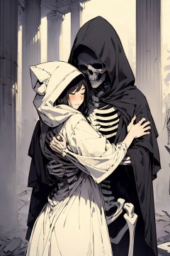 1girl, hood, hug, closed eyes, skeleton, 1boy, cloak, dress, long hair, torn clothes, robe, pillar, hood up, monochrome, ruins, outdoors, white dress